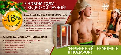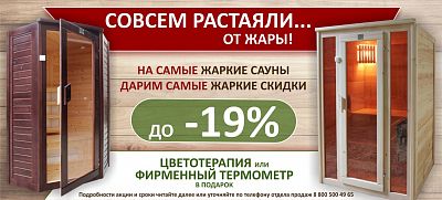 *Скидка 19% действует на все финские и инфракрасные сауны с керамическими нагревателями, скидка 9% действует на все инфракрасные сауны с карбоновыми нагревателями. При покупке любой инфракрасной сауны - дарим цветотерапию, при покупке финской сауны - фирменный термометр. Акция действует до 10 апреля 2019 г.