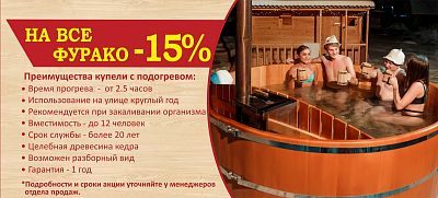 АКЦИЯ ЗАКОНЧЕНА• Акция действует на все изделия из дерева, кроме бань-бочек, бондарной продукции, офуро, душевых кабин и мебели.