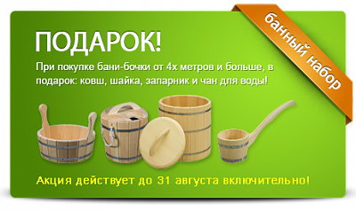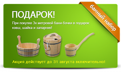 До 31 августа, при покупке 3х метровой бани-бочки в подарок: ковш, шайка и запарник!