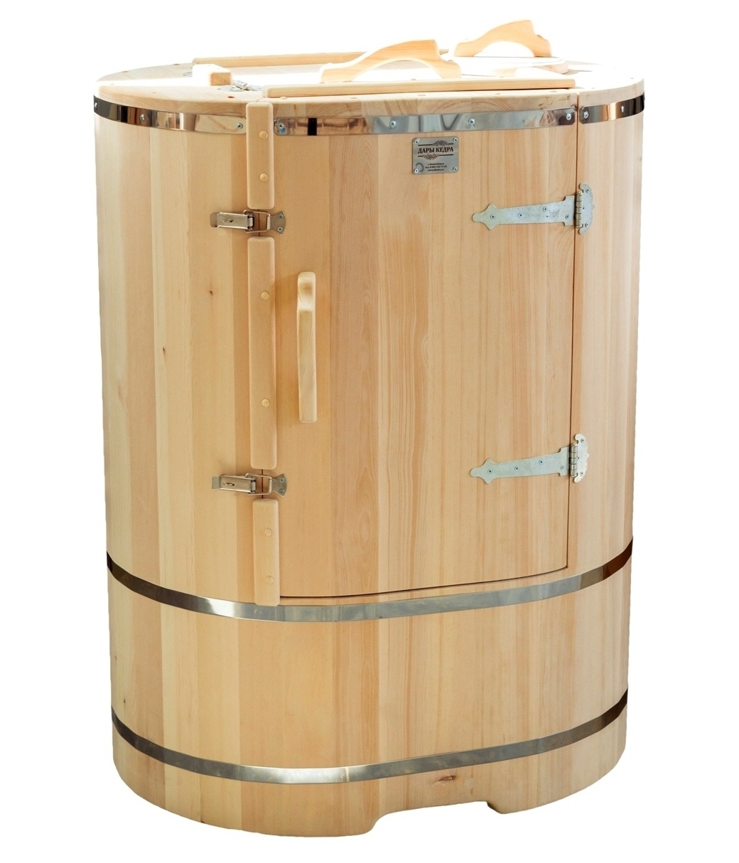 Кедровая бочка (фитобочка) овальная со скосом «Классическая» Овальная фитобочка из кедра - это мини парная, которую можно использовать не только в спа-салонах, но и дома. Овальная модель более просторна и удобна в использовании. Толщина стенок составляет 25 мм. Верхний скос делает положение головы более комфортным и улучшает обзор. Она оборудована откидными створками, дверцей и отверстием для головы. Во время парения человек сидит внутри кедровой бочки, а голова находится снаружи. Благодаря этому исключается возможность перегрева. Подлокотники из кедра, встроенные ручки на створках и двери делают эксплуатацию более удобной. Парение в фитобочке благотворно влияет на организм в целом: повышается иммунитет, выводятся шлаки и токсины, улучшается работа органов тела и состояние кожи.