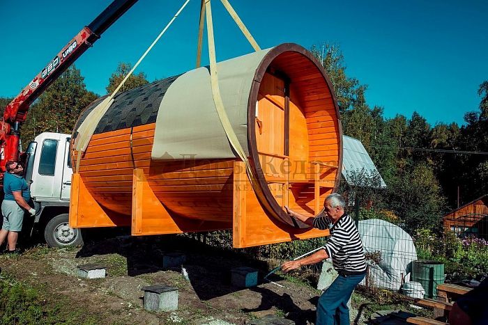 Отгрузка бани-бочки квадратной (6 метров с боковым входом)
