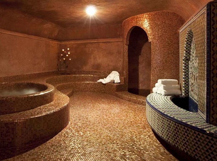 1. Принципы обустройства. Хаммам и финская сауна - это два принципиально разных вида парения. Во-первых, они отличаются внешним видом, принципом работы. Отделка хаммама внутри из камня или в классическом варианте – из мрамора. Лежанки («супа») тоже каменные. Они хорошо прогреваются и на них лежат, чтобы пропотеть, прогреть тело за счет пара, который поступает от парогенератора, расположенного в другом помещении. Горячий пар проходит по трубам, находящимся внутри пола и стен. Чтобы организовать пространство для парения в виде хаммама потребуются серьезные вложения как на отделку, так и на оснащение трубами, парогенераторами для равномерного распределения пара. Обустройство финской сауны в этом плане экономичнее, привычнее. Отделка парной - как правило, из древесины кедра.