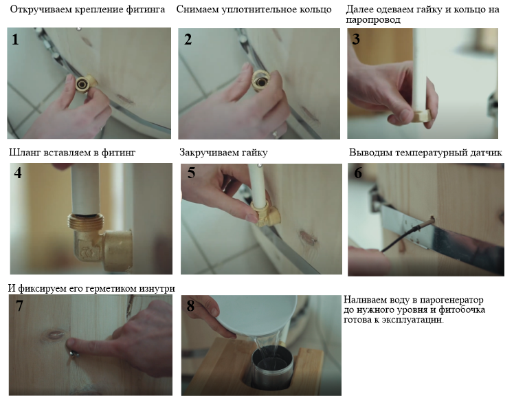 - На дне любой фитобочки имеется разводка пара (исключением составляют бочки с китайским ПГН, в них нет разводки пара в классическом ее представлении), разводка пара имеет выход с внешней стороны фитобочки (отверстие диаметром 16 мм на высоте 10-15 см), к нему нужно присоединить один конец паропровода, второй конец соединяется с парогенератором. Паропровод должен располагаться от ПГН к изделию без перегибов.