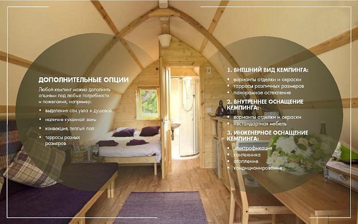 По желанию собственника кемпинга возможно соединить несколько строений в один комплекс. Такая опция будет интересна большим семьям или организованным загородным досуговым центрам, базам отдыха, спа-комплексам и т.д.